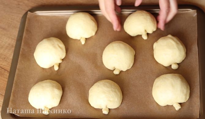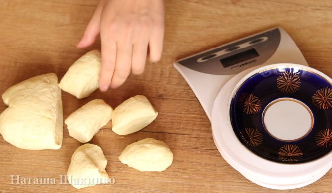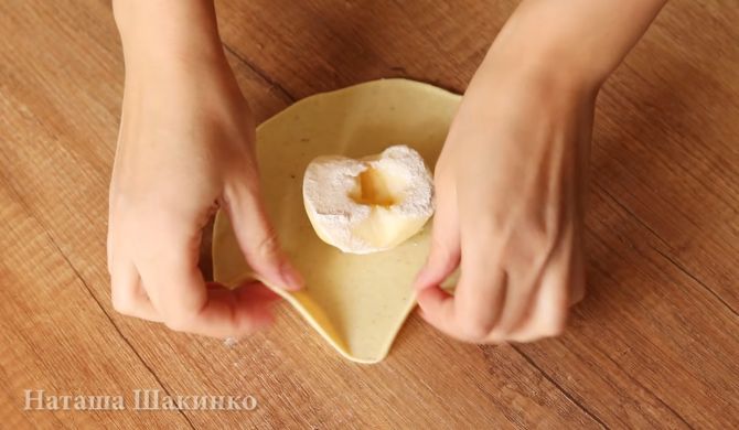 3. Накрываю и всё - наша начинка готова. Возвращаясь к тесту. Его необходимо нарезать на одинаковые кусочки весом 50 грамм. Всего у меня получилось 8 кусочков и также один кусочек побольше для листиков. Беру кусочек теста и скатываю его в шар. Теперь его необходимо раскатать в круг до толщины 2 3 миллиметра. Беру половинку яблока слегка обваливаю его в муке и кладу на тесто. Собираю тесто и хорошо защипываю его у основания. Если появились какие-то складочки, то ничего страшного они легко приглаживаются руками. Вот что у нас должно получиться.
