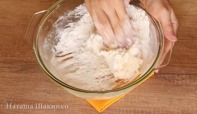 2. Примерно половину сухих ингредиентов всыпаю в творожную смесь и хорошо перемешиваю. Всыпаем вторую половину и замешиваю тесто. Тесто получается средней плотности. Оно хорошо держит форму и не липнет к рукам. Накрываю тесто и оставляю на минут 15 при комнатной температуре. А в это время подготовим яблоки для начинки. Желательно взять яблочки небольшого размера. Очищаем их от кожуры, разрезаем пополам и удаляем сердцевину.