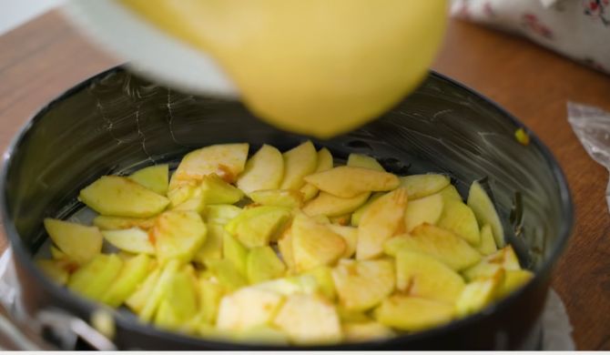 2. Для теста: 2 крупных яйца, щепотка соли, 10 г ванильного сахара, 100 г обычного сахара. Взбить 3–4 минуты. 1 ст. л. растительного масла, 120 г молока перемешать. 250 г муки и 1 ч. л. разрыхлителя (6 г). Добавить муку к жидким ингредиентам. В описании под видео есть подробный рецепт в письменном виде. Очистить 2–4 яблока от кожицы и от сердцевины. Нарезать яблоки на кусочки. Смазать форму сливочным маслом. Диаметр формы 21 см. Выложить яблоки.
