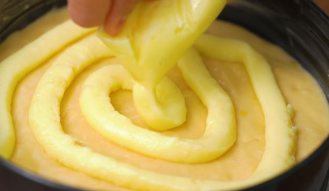 3. Заранее включить духовку на 180 градусов. Выложить тесто на яблоки. Переложить крем в плотный пакет. Обрезать край пакета. Выложить крем на тесто в форме спирали. Выпекать 35–45 минут до полной готовности. В моей духовке пирог выпекался 45 минут, но вы ориентируйтесь на свою духовку.