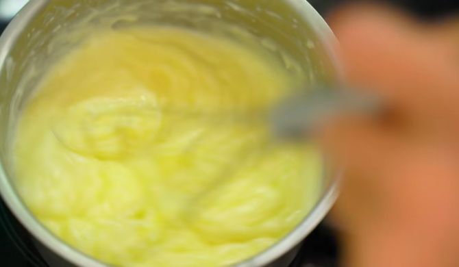 1. Для заварного крема: 1 крупное яйцо, 40 г сахара, 20 г кукурузного крахмала перемешать до однородности. Добавить 250 г молока, перемешать. Заварить крем на умеренном огне, постоянно помешивая, до загустения. Как только вы увидите первые пузыри воздуха, проварить еще 30–60 секунд, снять с огня. Добавить щепотку соли для баланса вкусов, 10 г ванильного сахара, 20 г сливочного масла, перемешать, накрыть пищевой пленкой и оставить до остывания.